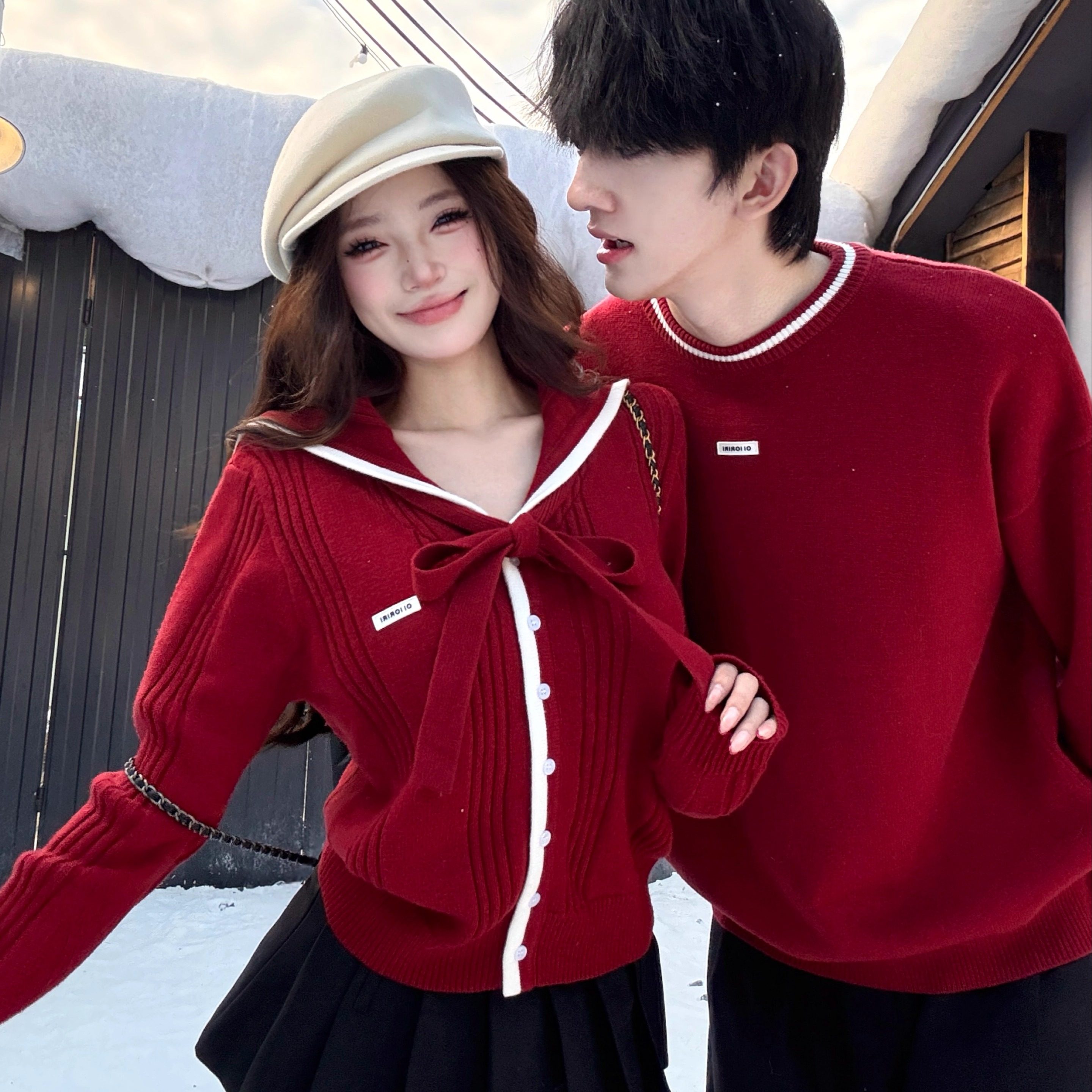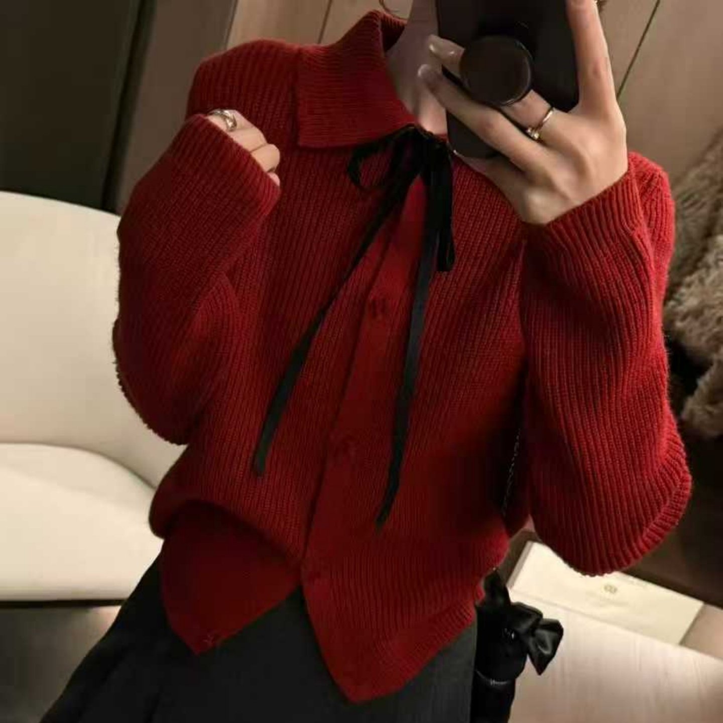 红色蝴蝶结系带毛衣女秋冬情侣装淑女风针织开衫新年款上衣2025潮