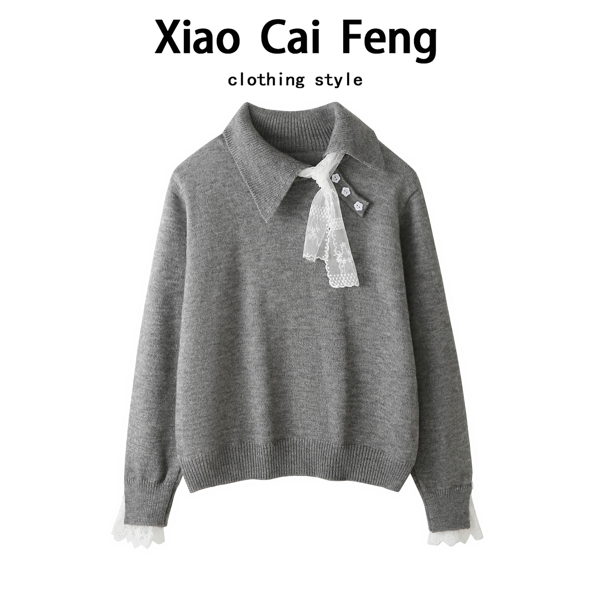 韩系巨好看灰色翻领蕾丝系带毛衣女秋冬慵懒风宽松针织衫休闲上衣