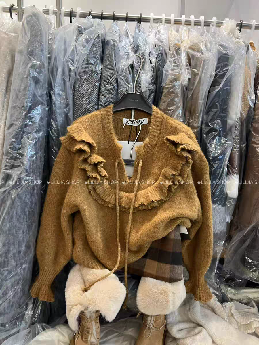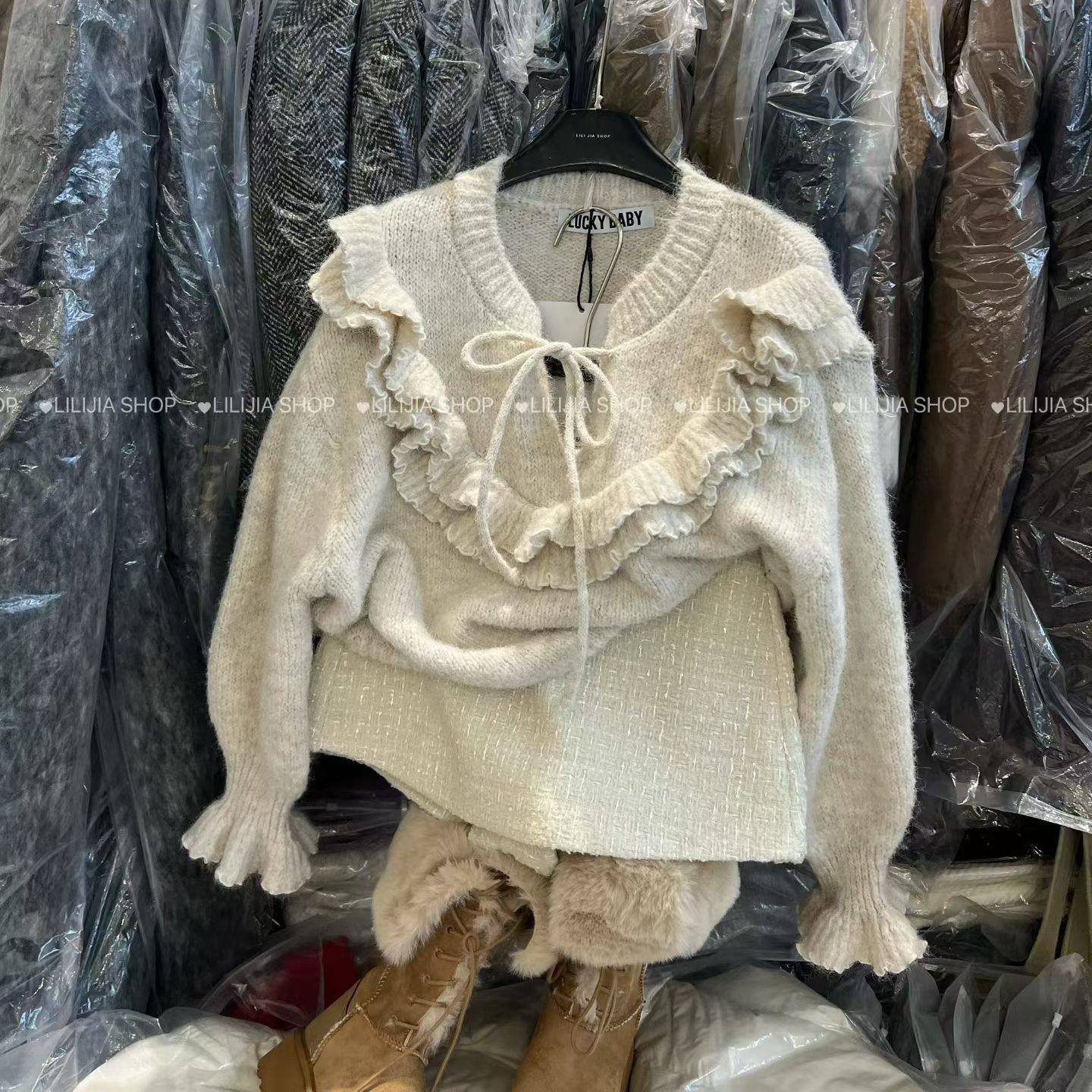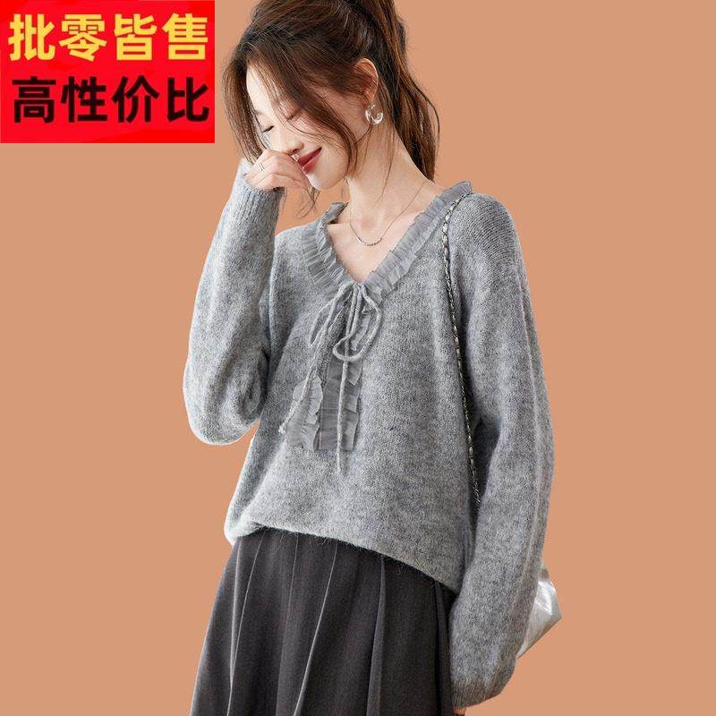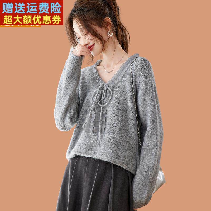 MH家 2025新款法式复古荷叶边系带毛衣女洋气减龄针织衫上衣