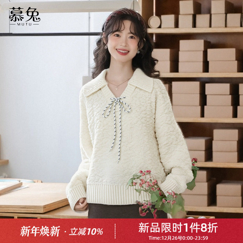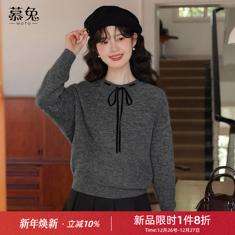 慕兔法式小香风蝴蝶结系带毛衣女2025冬季新款高级感长袖针织上衣