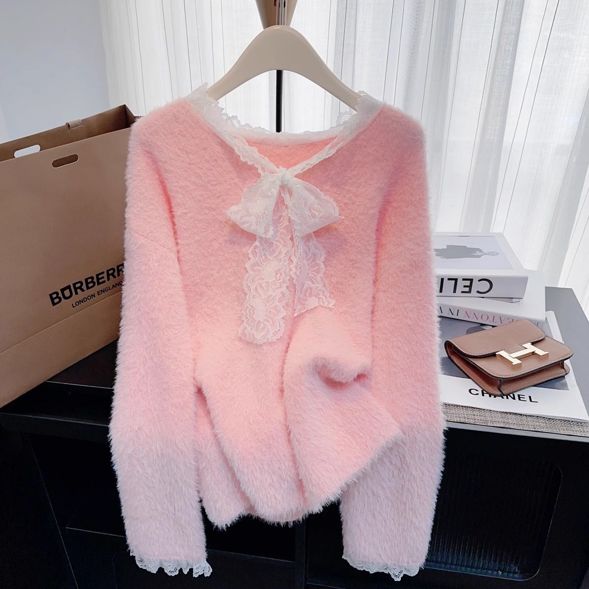 2025冬季新款韩版宽松女浣熊绒套头毛衣慵懒风后背系带蝴蝶结设计
