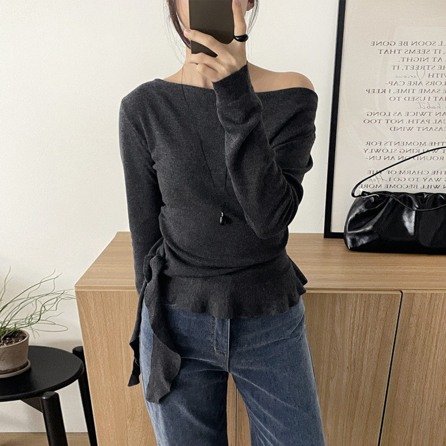 设计感一字领不规则荷叶边系带毛衣女秋冬季纯色百搭显瘦针织上衣