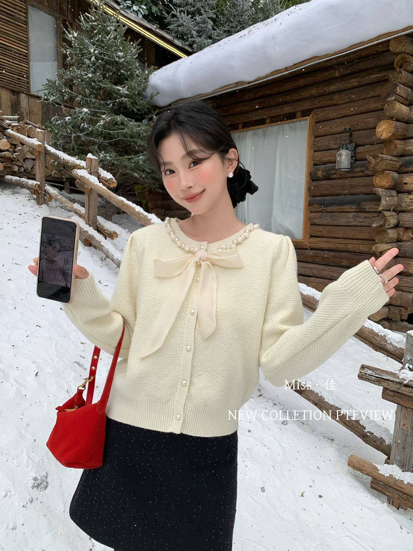 慕兔法式温柔风蝴蝶结系带毛衣女2025冬季新款小个子长袖针织上衣