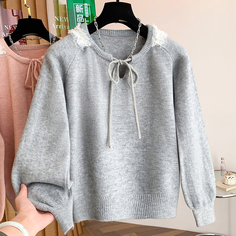 法式纯欲蕾丝蝴蝶结系带毛衣女秋冬季新款内搭修身打底针织衫上衣
