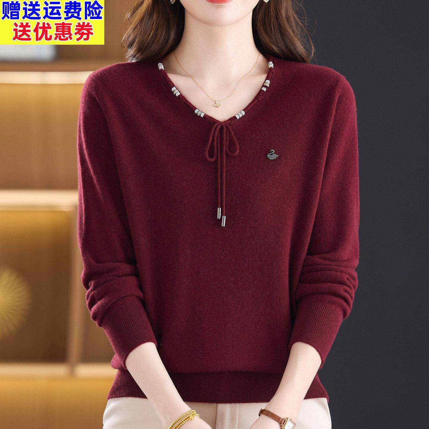 高级感V领系带毛衣女秋冬酒红色100纯羊毛衫妈妈装内搭针织打底衫