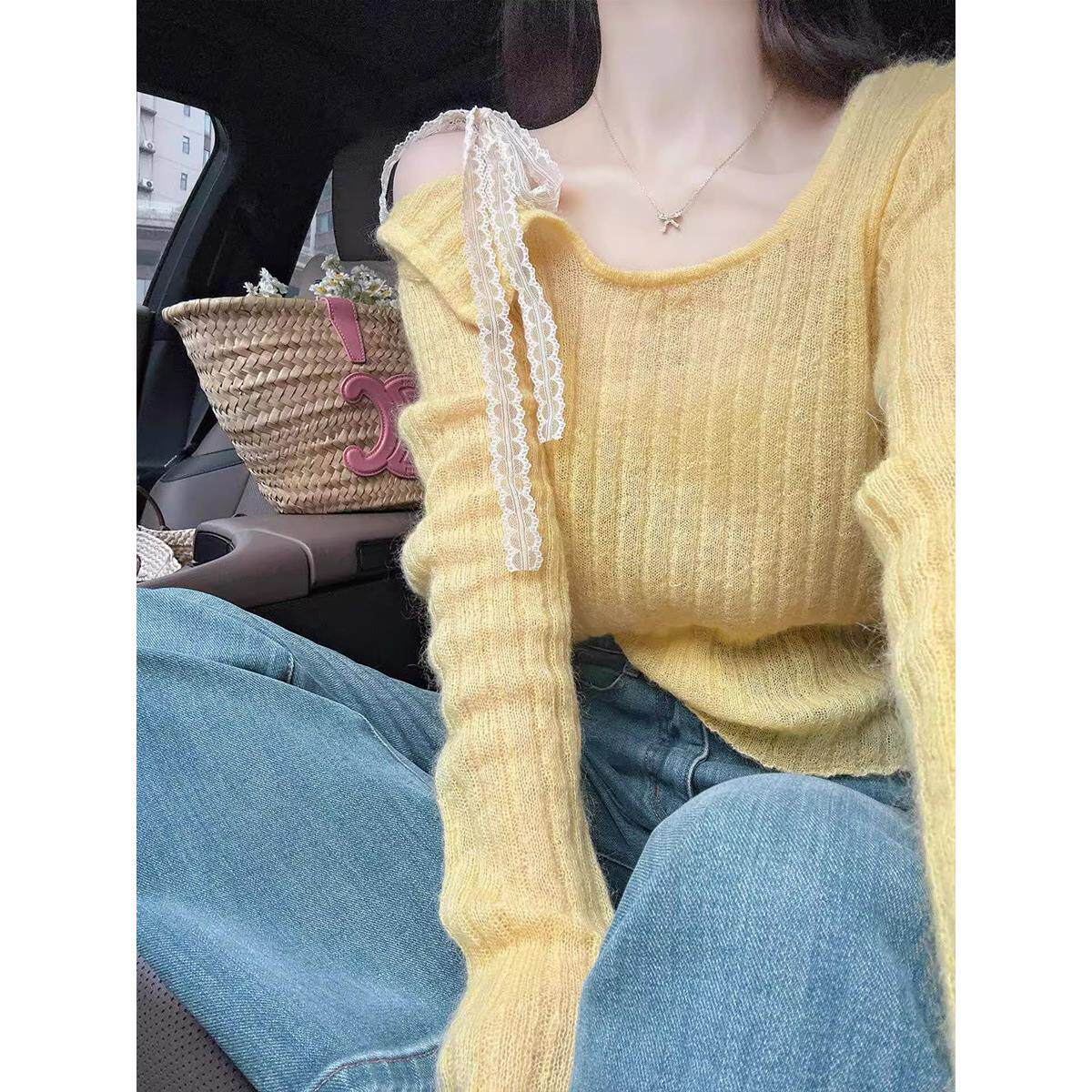 rouje bonjour黄色露肩蕾丝系带毛衣女春秋女设计感温柔针织上衣