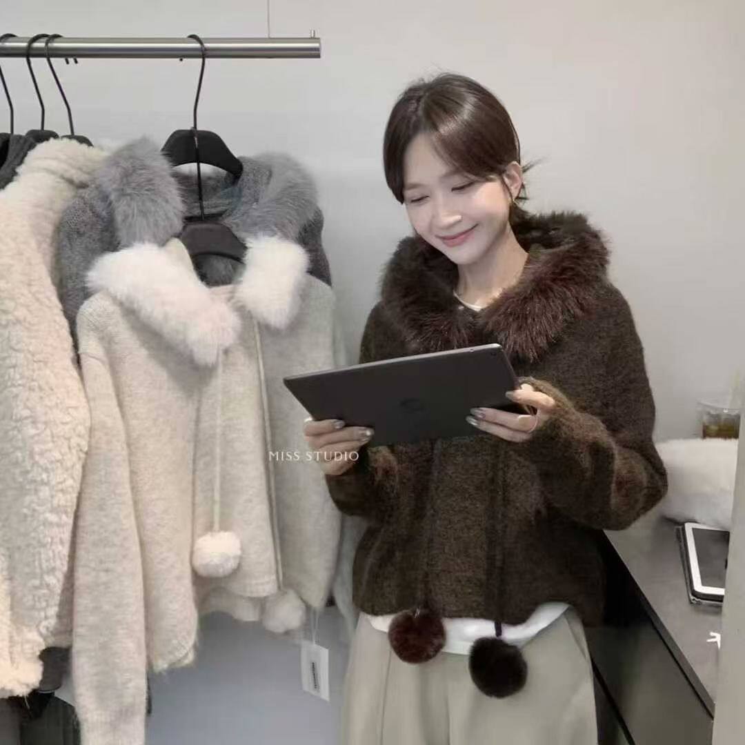 2025年新款高级感氛围感毛毛领系带毛衣女冬季韩系保暖长袖针织衫