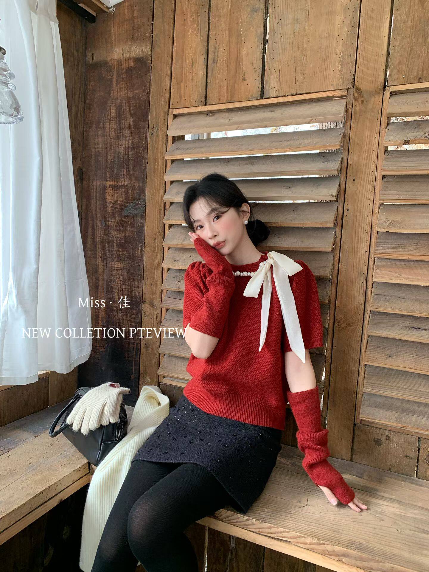 温柔风重工珍珠蝴蝶结系带毛衣女新款粉色减龄针织衫分袖毛衣上衣
