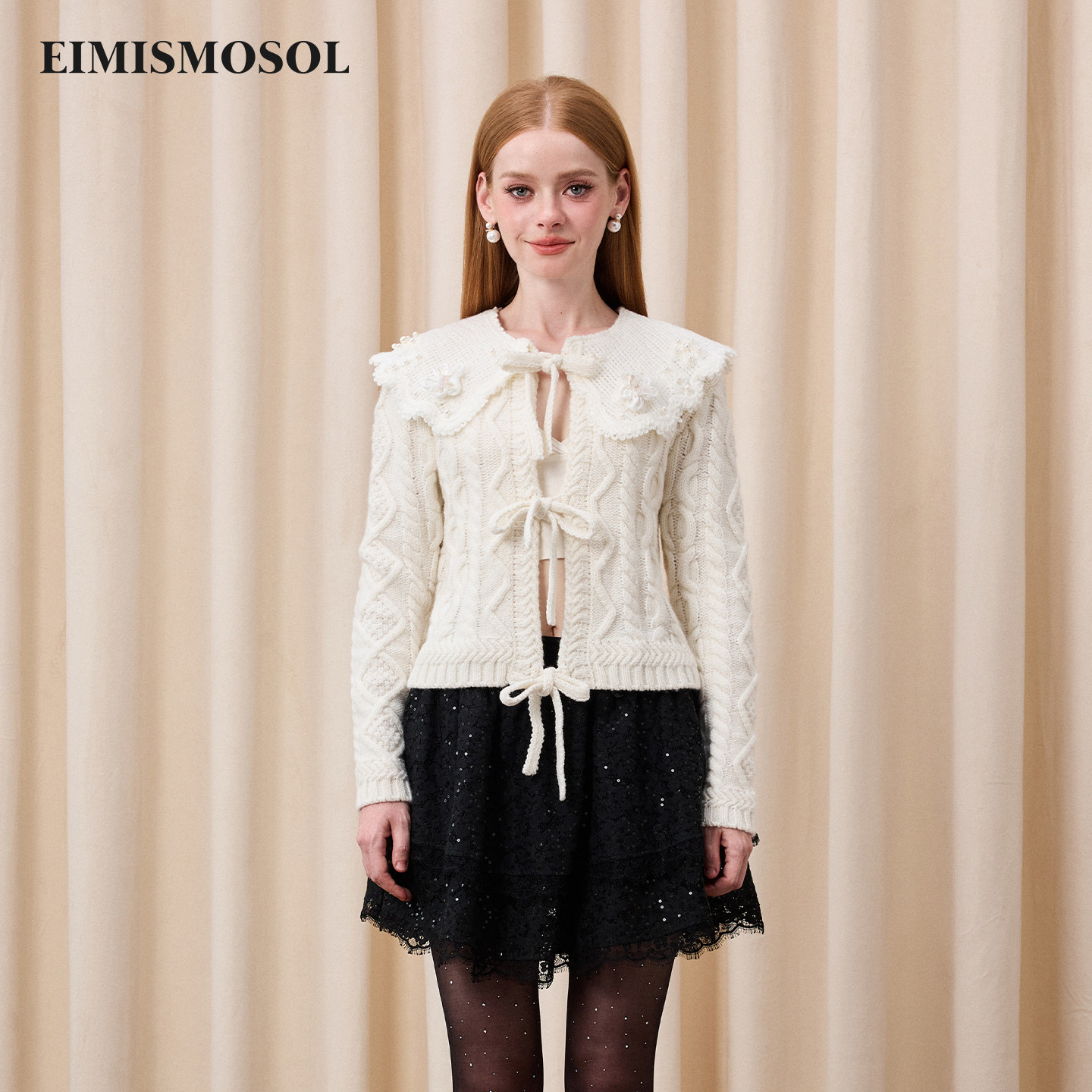 Eimismosol2025秋冬新品法式羊毛翻领短系带毛衣女优雅针织开衫