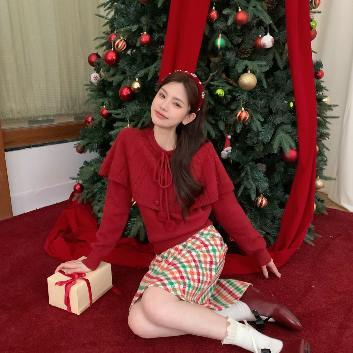 PynkiSwear 红色/白色 假两件仿披肩系带毛衣修身针织短款上衣女
