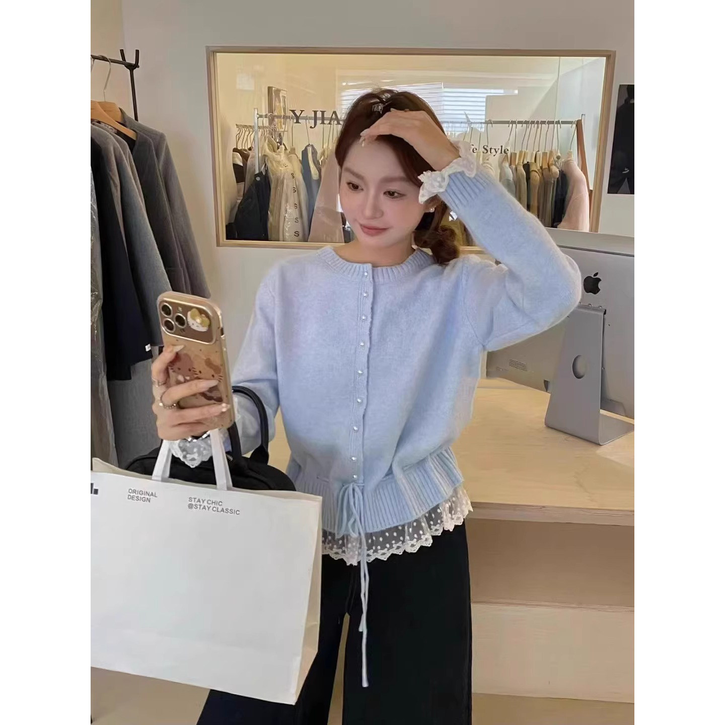韩系甜美蕾丝花边收腰系带毛衣女秋冬季加厚宽松针织开衫上衣外套