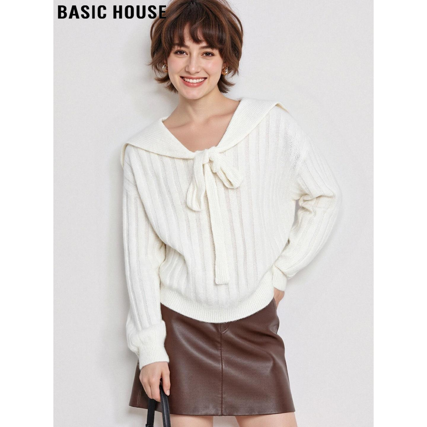 Basic House/百家好100%羊毛蝴蝶结系带毛衣女冬季高级坑条针织衫