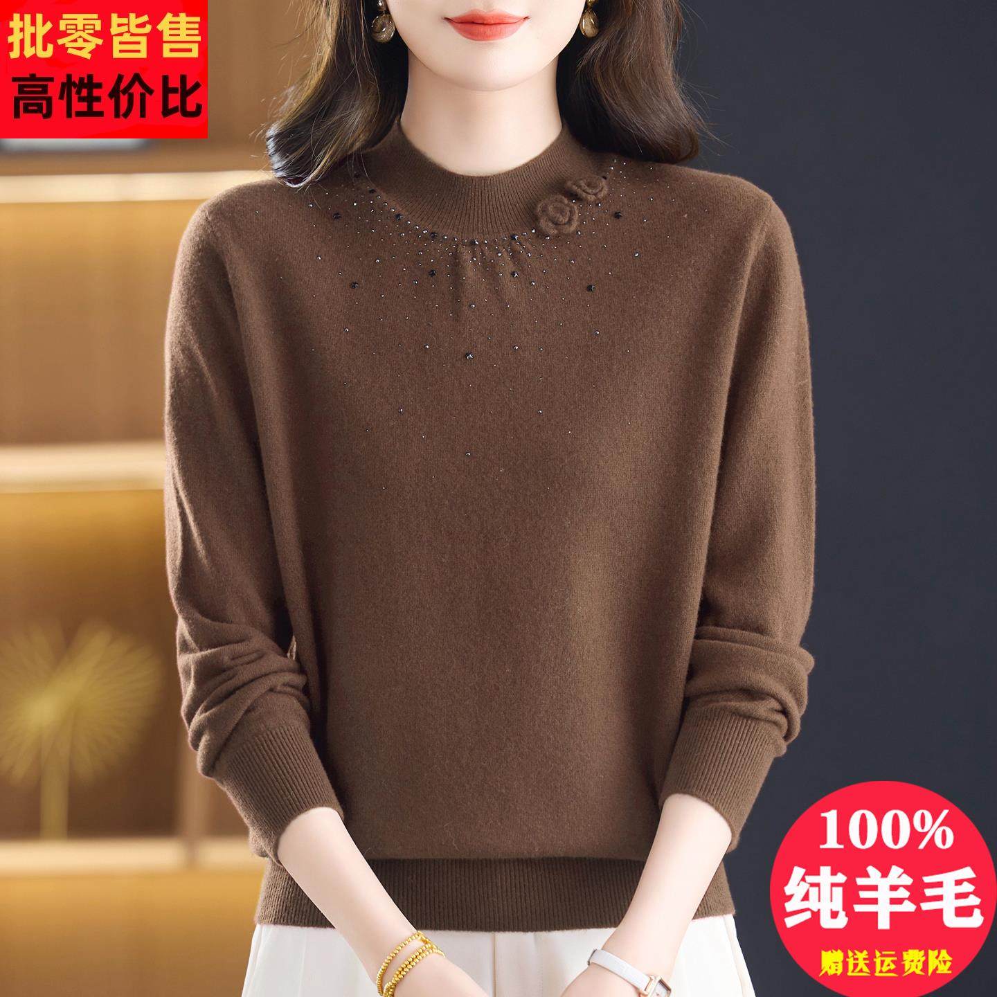 高档咖色100纯羊毛衫女秋冬2025新款半高领钉珠洋气妈妈打底毛衣