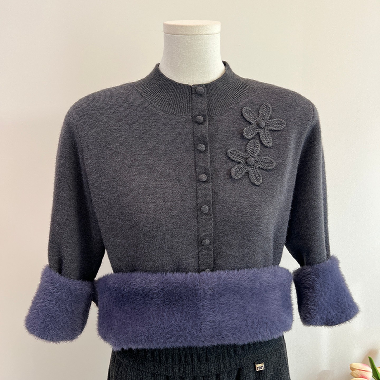 2025新款立体蝴蝶加绒加厚毛衣中老年针织打底衫妈妈秋冬保暖套装