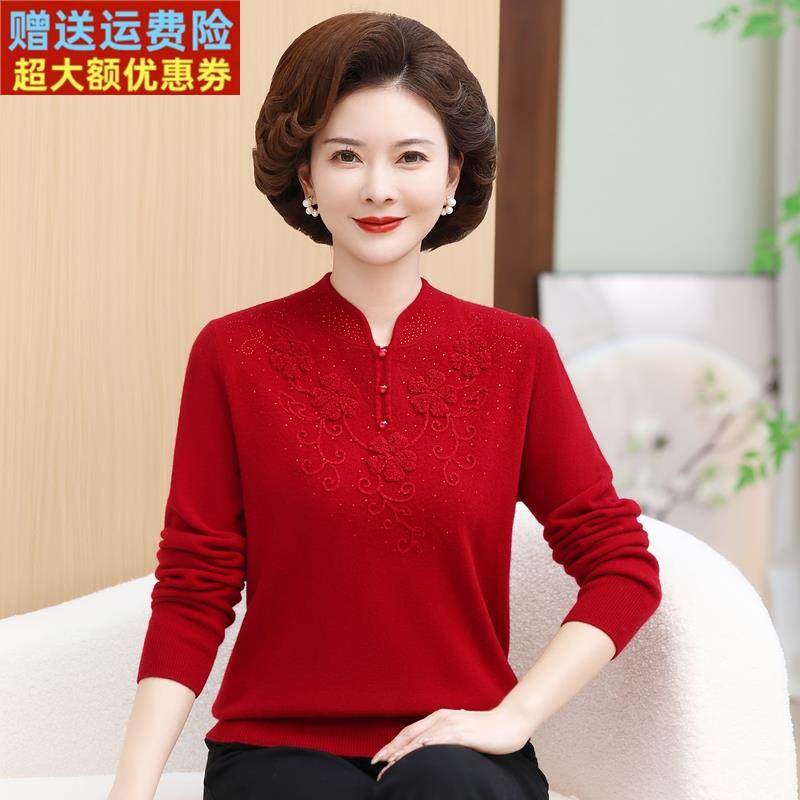 秋冬旗袍领绣花本命年妈妈打底毛衣100%纯羊绒衫女中老年针织上衣