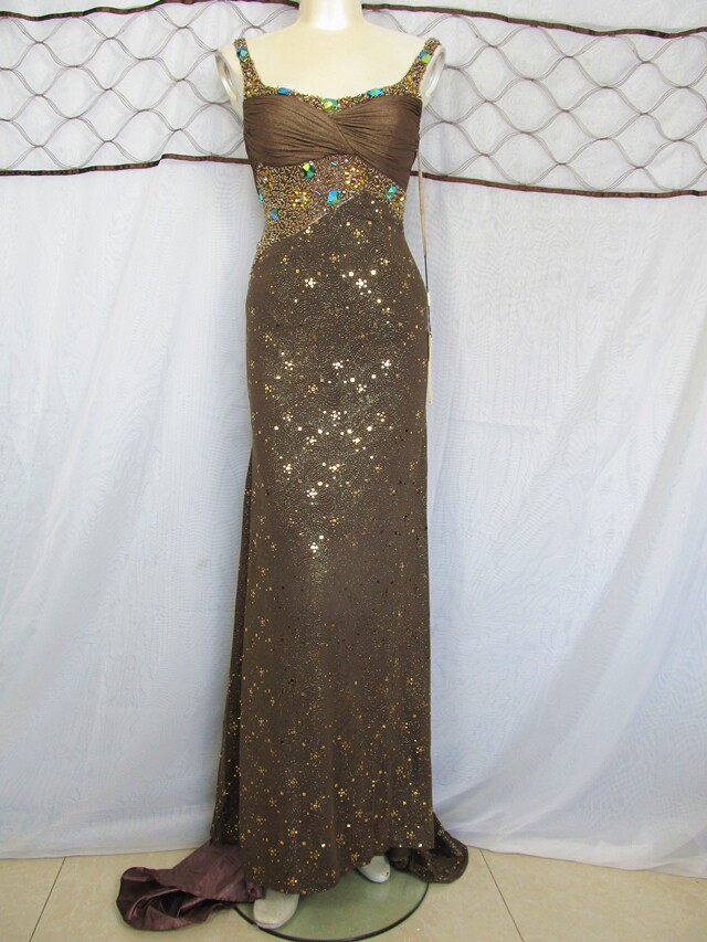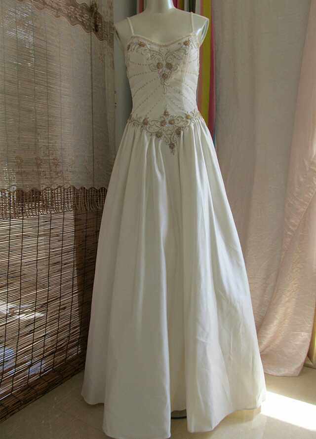 魅惑新款英国原单重工厚绸缎钉珠吊带大裙摆长款坠地晚礼服连衣裙