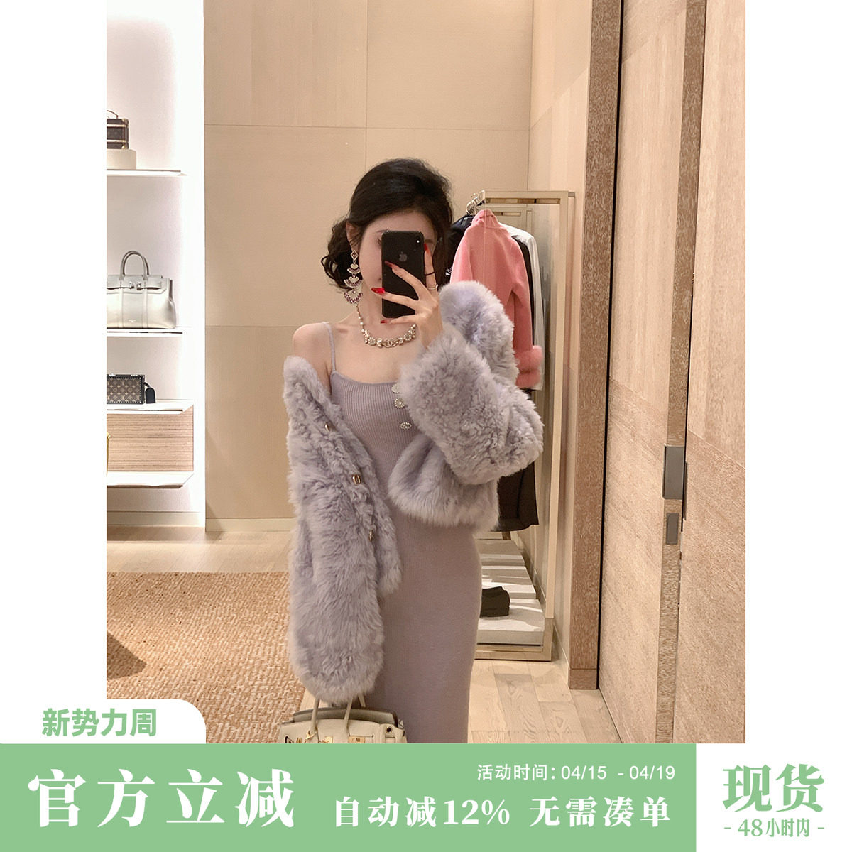 预售设计师MOOD X MIURA紫色短款钻扣毛衣开衫闪光露背吊带连衣裙