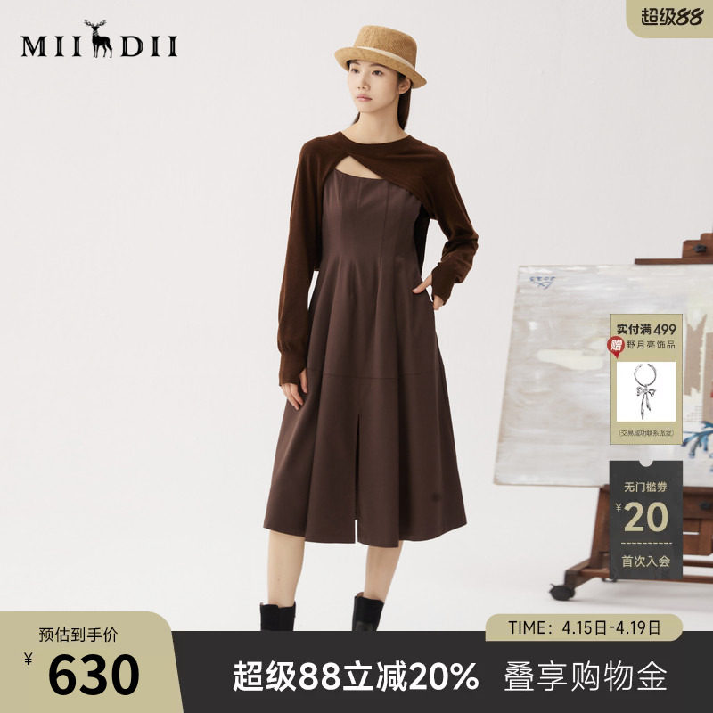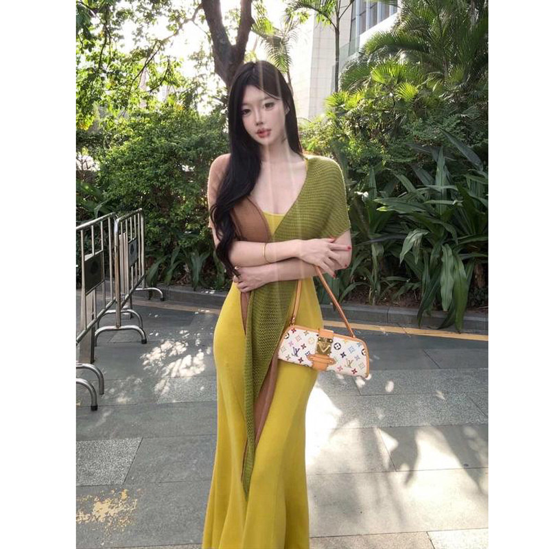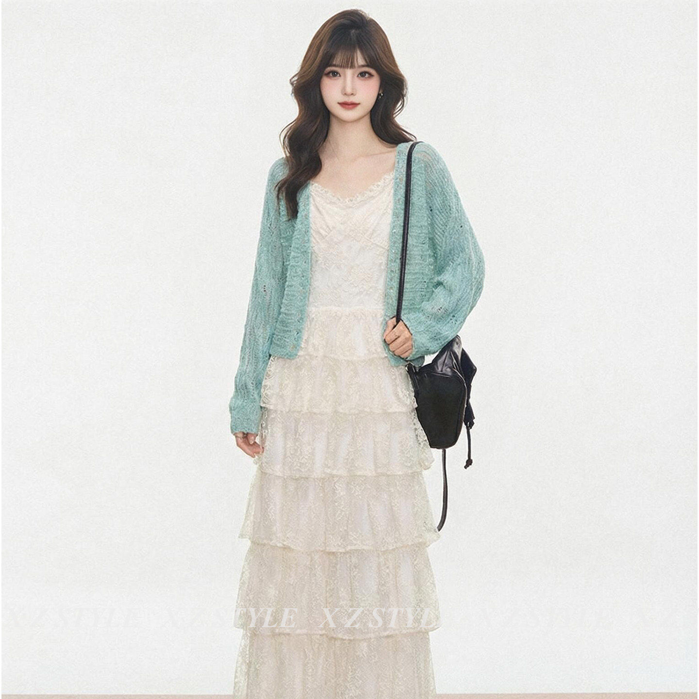 - 春装小清新长袖碎花雪纺连衣裙套装裙中长款宽松吊带网纱裙两件套