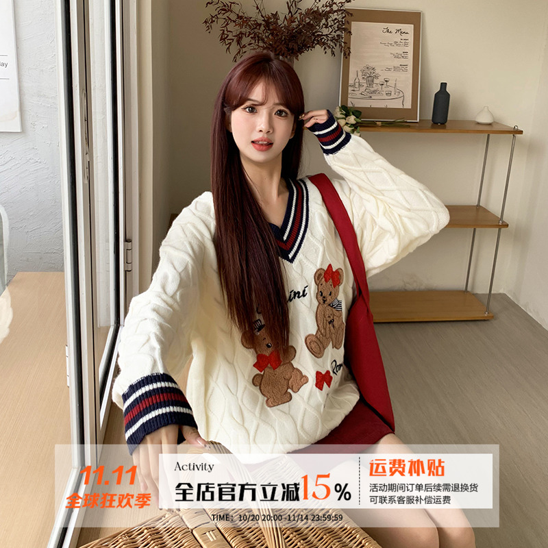 橘子树在哪儿学院风V领撞色小熊毛衣女秋冬季宽松慵懒针织衫上衣
