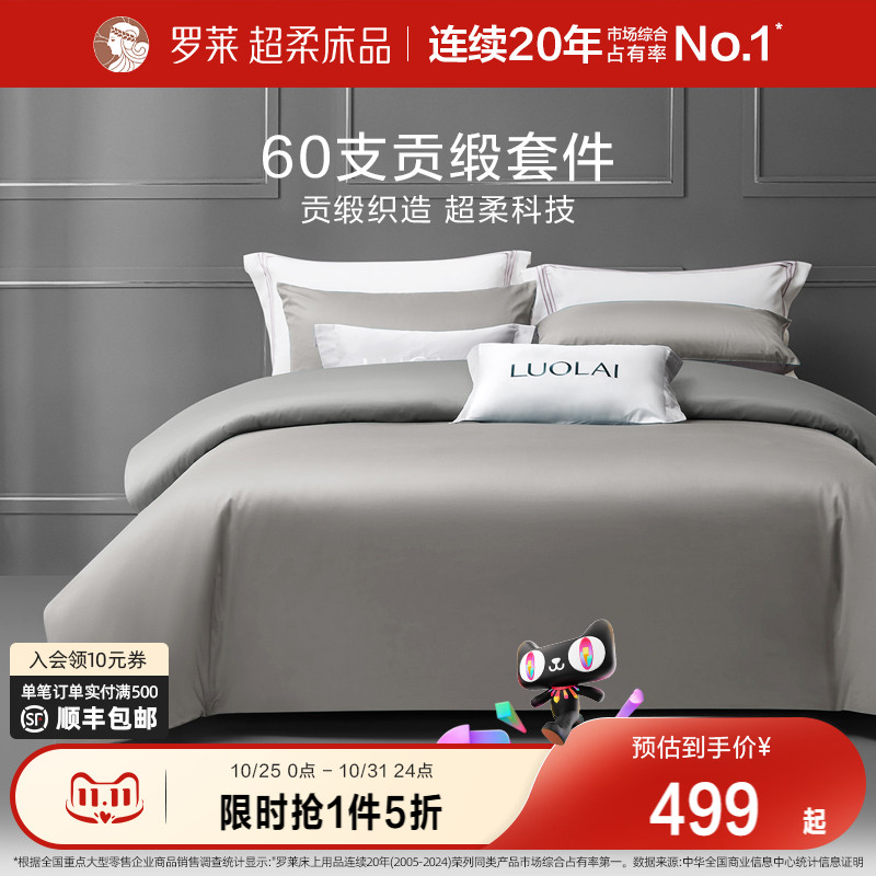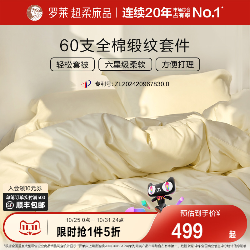罗莱家纺官方60支贡缎四件套纯棉被套床品秋冬全棉超柔U易套套件