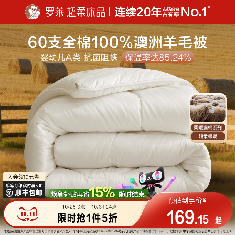 罗莱家纺澳洲进口100%纯羊毛被防螨抗菌春秋被芯被子冬被四季通用