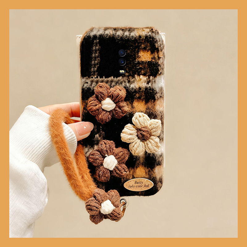 毛绒针织花朵适用oppor17手机壳r15x拼色r11splus格纹r11s带r9挂绳r9plus秋冬r7s毛茸茸r17pro绒布oppo女0pp0