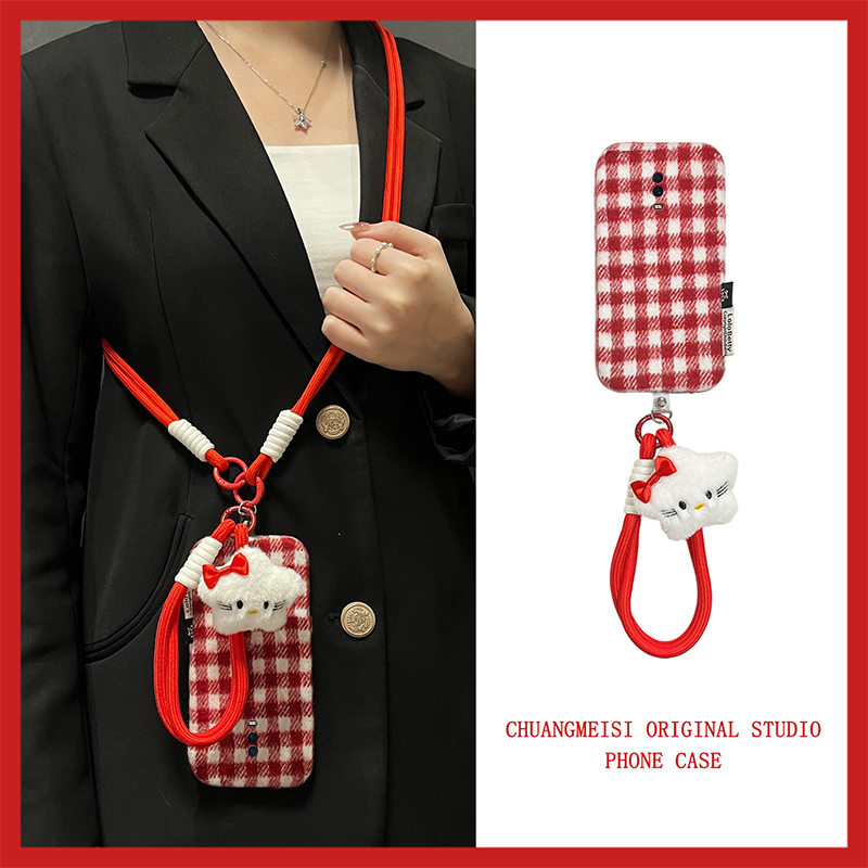 适用oppor17手机壳r15斜挎r11红色r9s棋盘格r11s带r15x梦境版r17pro挂绳r9plus秋冬k1绒布r7格子oppo星星kt猫