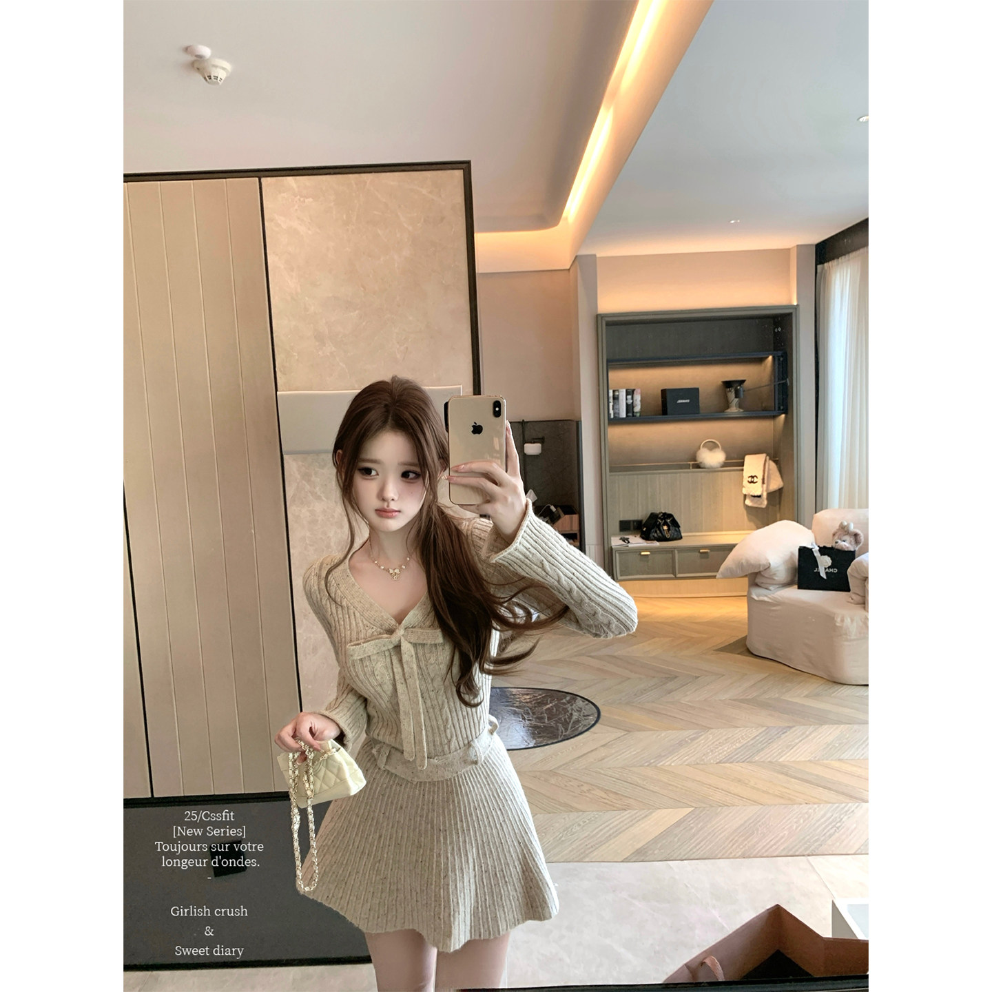 迟伞伞25/fw 甜杏杏子 定染纱线杏粉蝴蝶结针织上衣短裤温柔套装