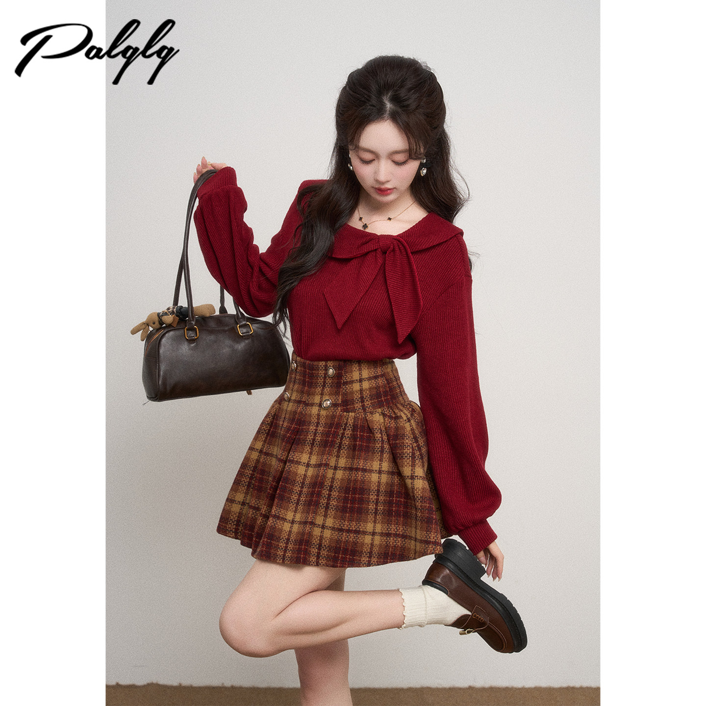 迟伞伞25/fw 灰色风信子 彼得潘领蝴蝶结针织上衣百褶半裙套装