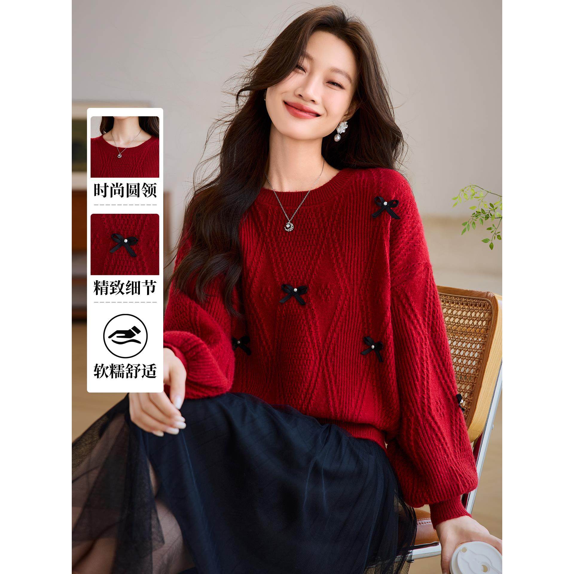 今年流行爆款的蝴蝶结针织上衣女2025新款秋冬宽松红色毛衣打底衫