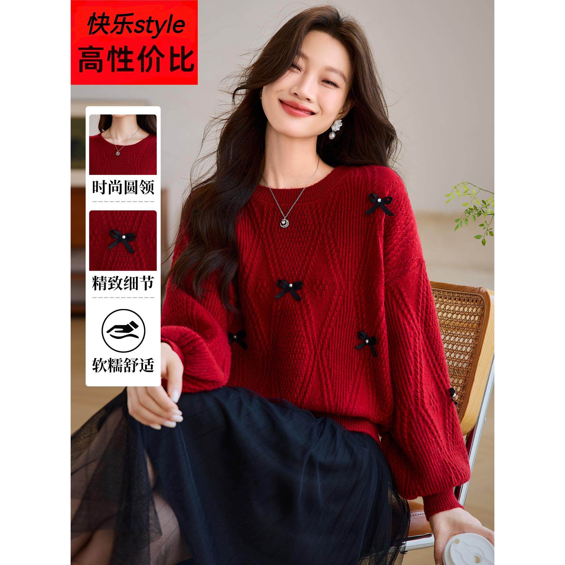 设计感圆领红色套头毛衣女外穿2025年秋冬新款法式蝴蝶结针织上衣