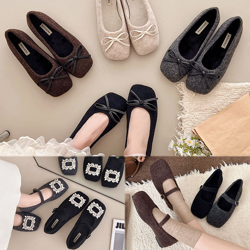 方头秋冬季蝴蝶结韩版平底单鞋浅口休闲平跟豆豆鞋薄绒软底不累脚