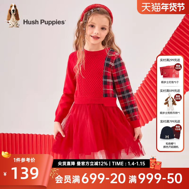 暇步士童装女宝宝针织连衣裙秋冬新款可爱网纱拼接裙红色新年裙子
