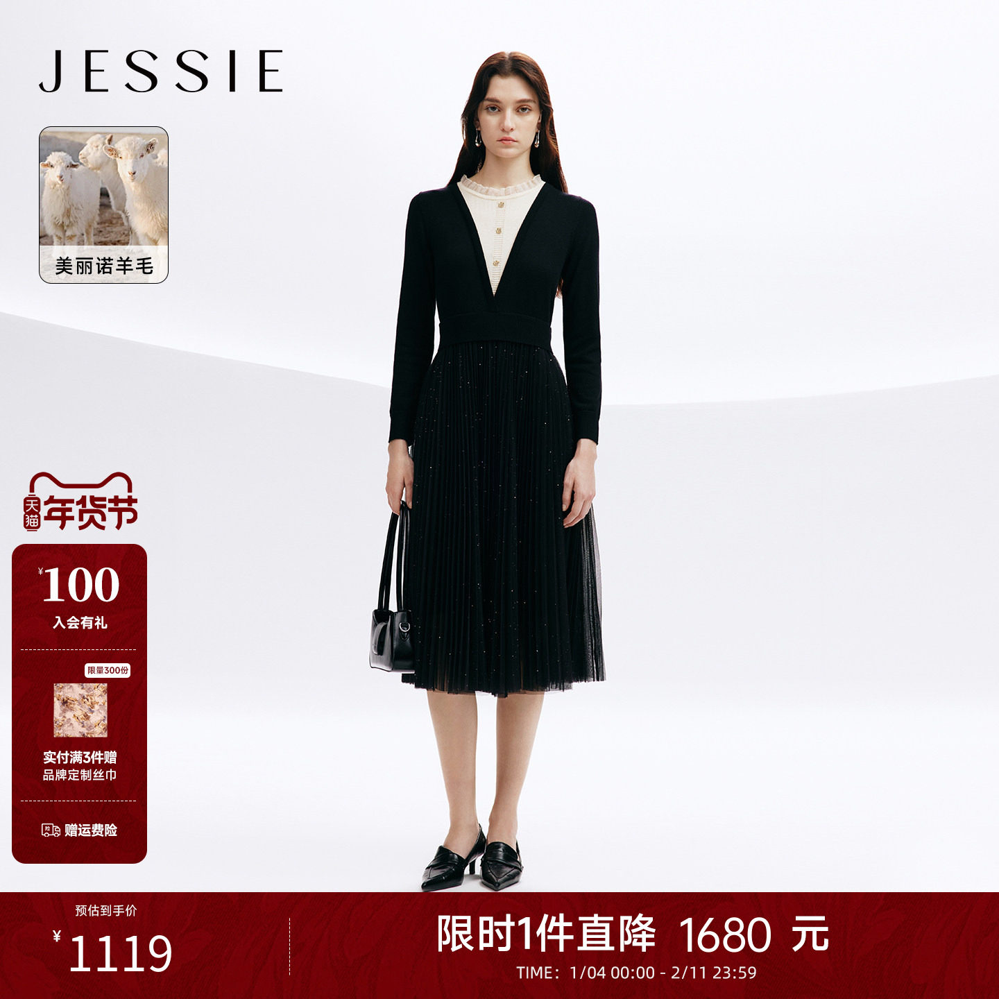 JESSIE细闪网纱拼接假两件羊毛连衣裙女秋冬新款撞色木耳边领2025