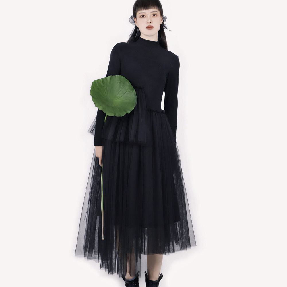 ONMOON 黑色针织拼接植物染网纱连衣裙 2025秋冬高领修身长袖裙子