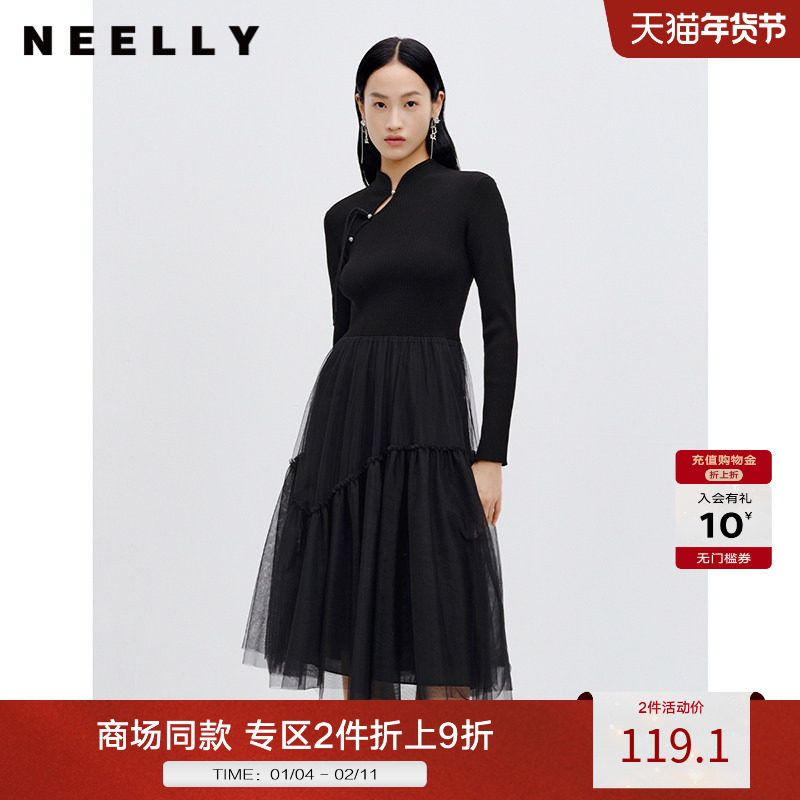 NEELLY纳俪商场同款针织网纱拼接连衣裙女秋冬新款黑色新中式长裙