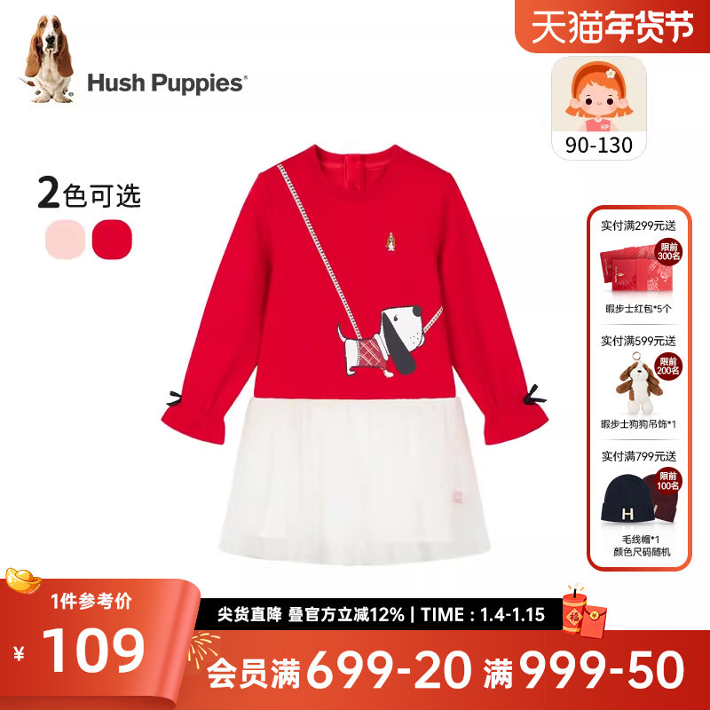 暇步士童装女宝宝长袖连衣裙秋冬新款卫衣网纱拼接裙子洋气拜年服