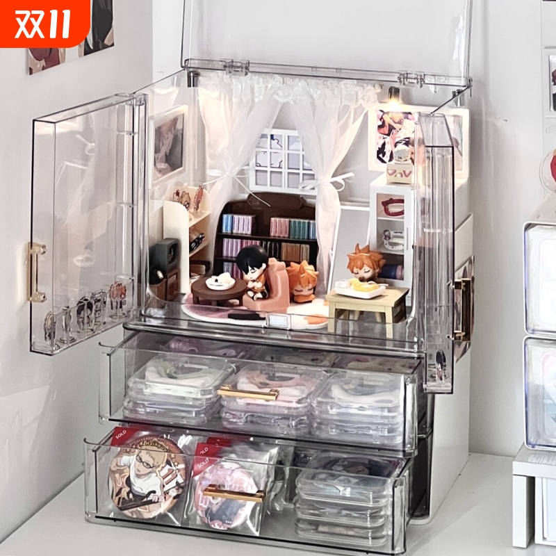 化妆柜改造桌面小痛柜!透明多层吧唧立牌摆件谷子防尘抽屉收纳柜