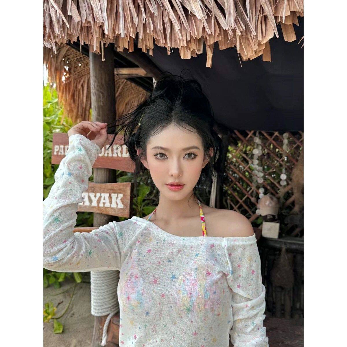 特价跨境日韩泳装星星长袖罩衫宽松套头微透绑带碎花比基尼游泳衣