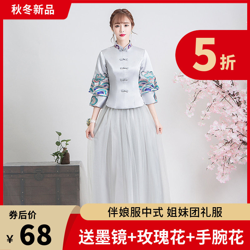 伴娘服中式灰色长裙春秋伴娘团长款姐妹裙礼服2024新款秀禾服创意