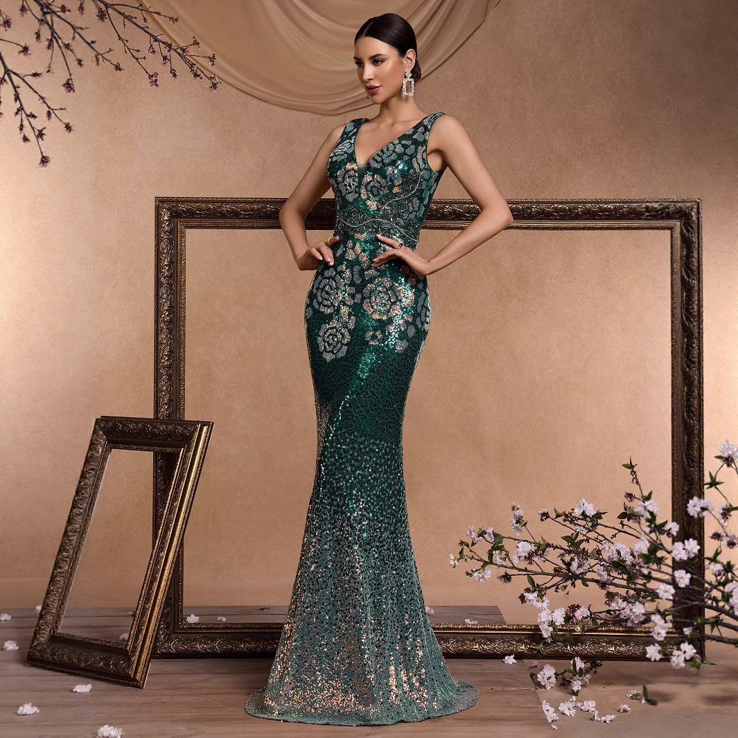 欧美新款长款深V优雅珠片绣花气质正式酒会晚宴礼服奢华伴娘长裙