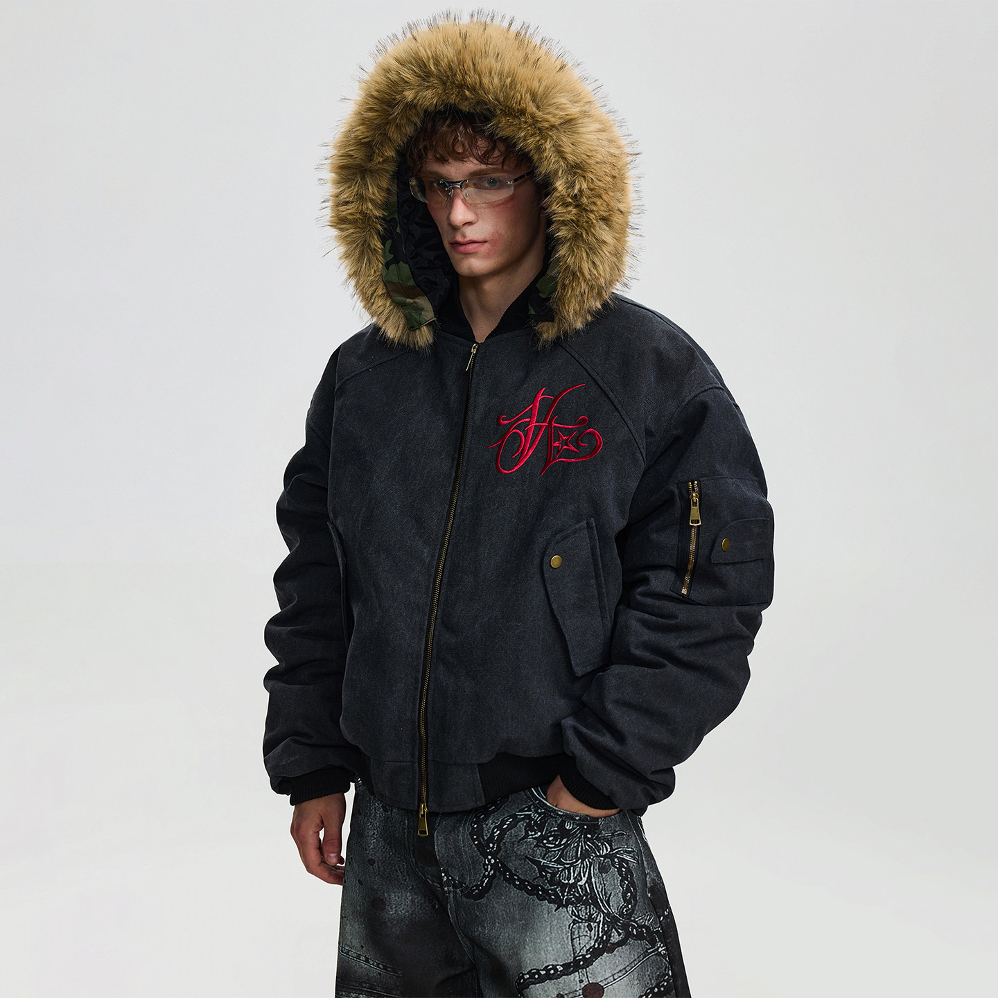BTSG“可拆卸帽子毛领”重磅美式刺绣迷彩座山雕连帽夹克棉服外套