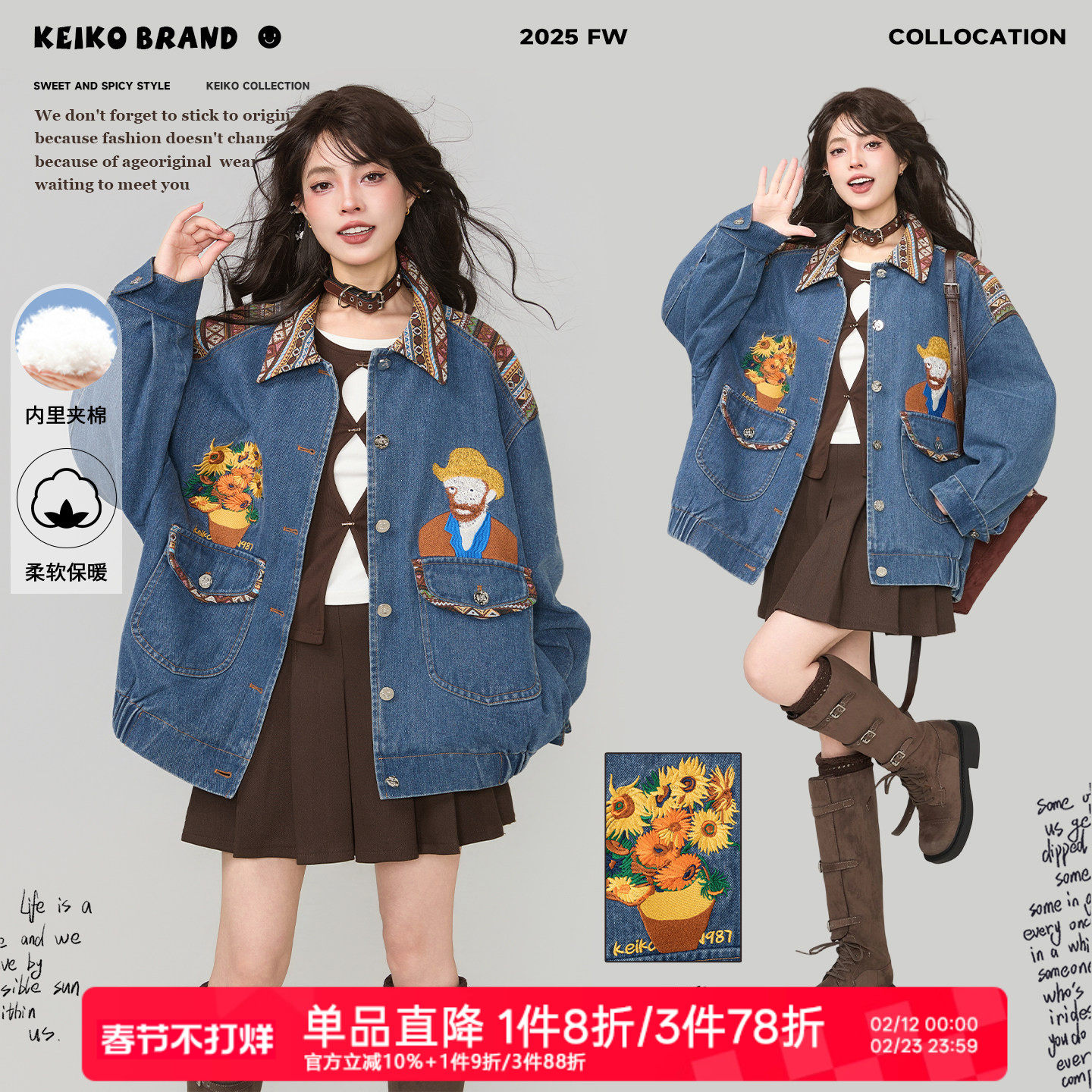 KEIKO [夹棉/保暖] 文艺感刺绣牛仔棉服外套春季法式宽松拼色夹克