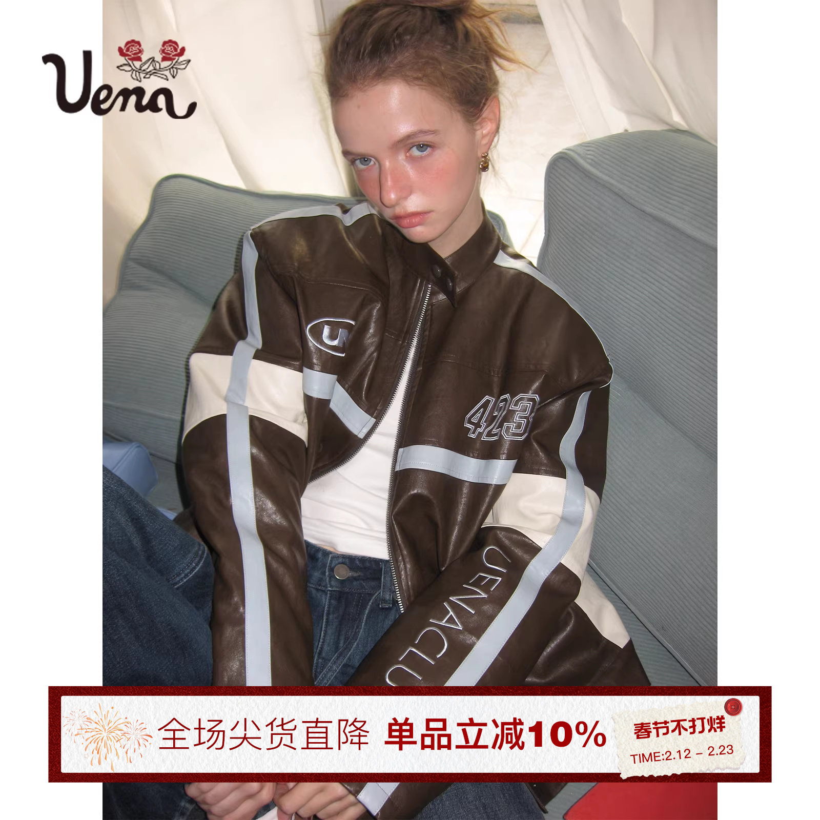 【暖冬心结】Uena棕色撞色字母刺绣立领落肩袖PU皮衣夹克棉服外套