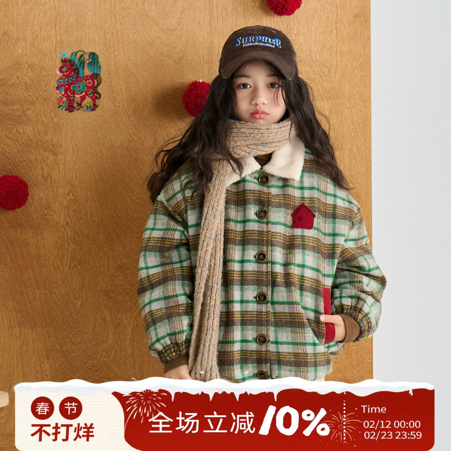 OLAMIMI儿童亲子2025冬毛呢格纹立体刺绣羔毛领棉服夹克夹棉外套
