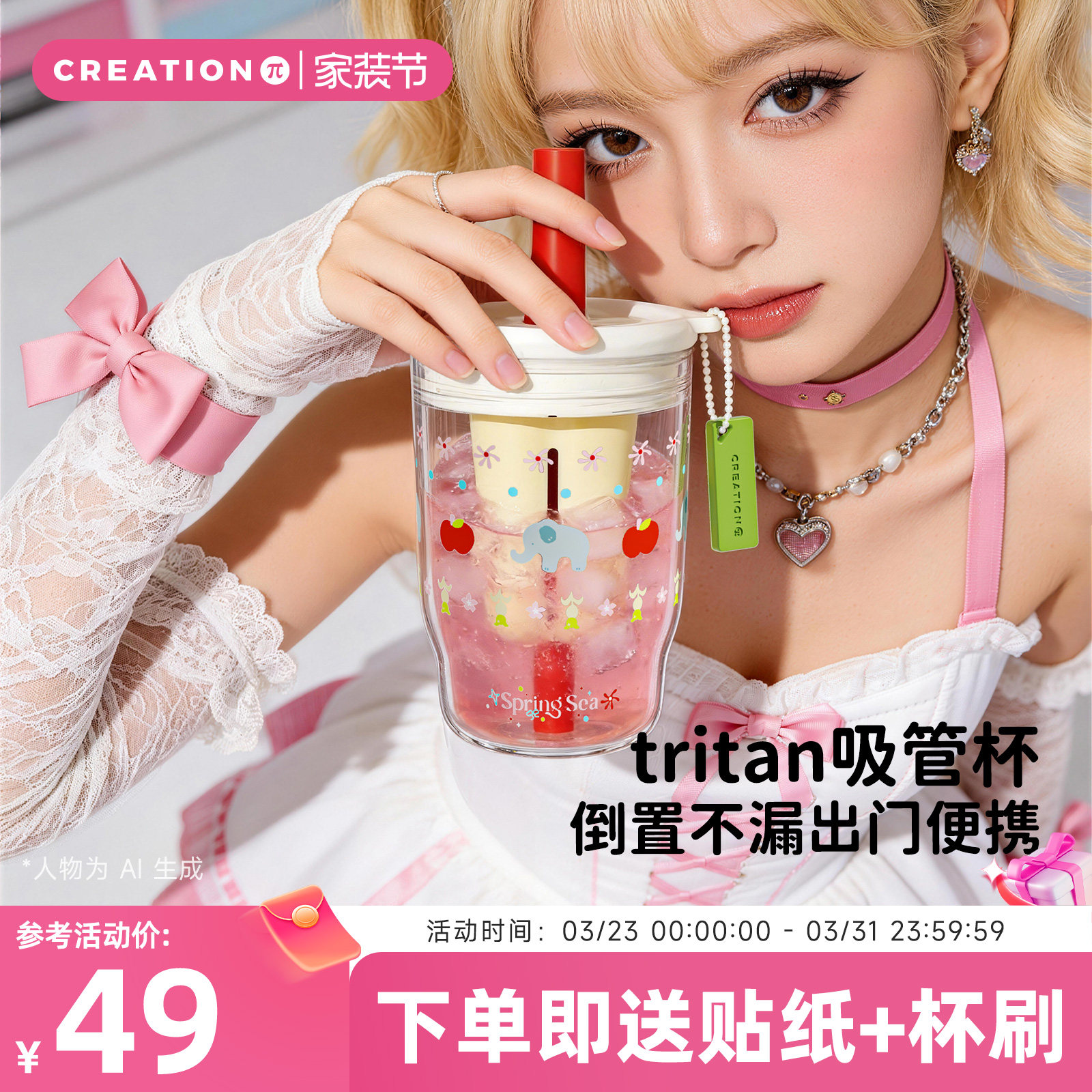 元森商店Tritan塑料水杯夏天女生粉色学生吸管杯可爱大容量双饮杯
