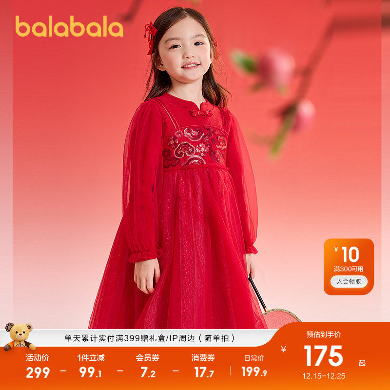 【国博IP】巴拉巴拉童装女童连衣裙2025春秋装新款拜年服儿童红裙