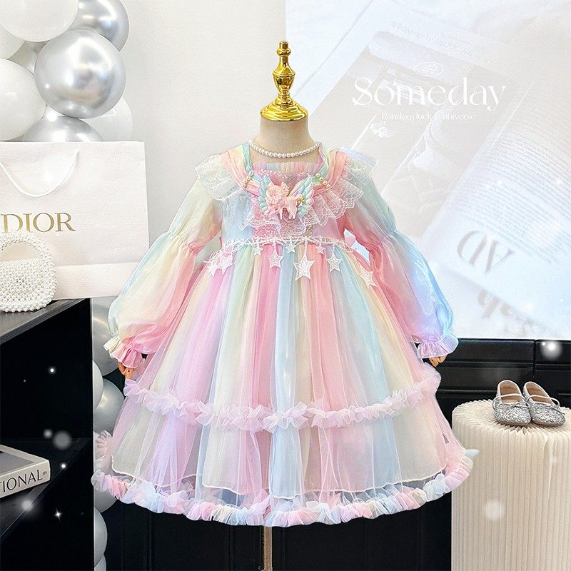女童连衣裙春秋款2025新款儿童洋气彩虹公主裙小女孩蓬蓬纱仙女裙