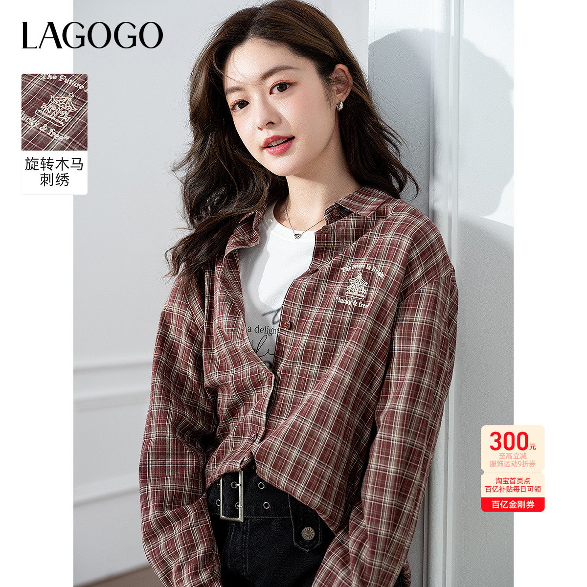 LAGOGO琥珀港风复古格子衬衫女拉谷谷2025秋冬新款宽松长袖上衣