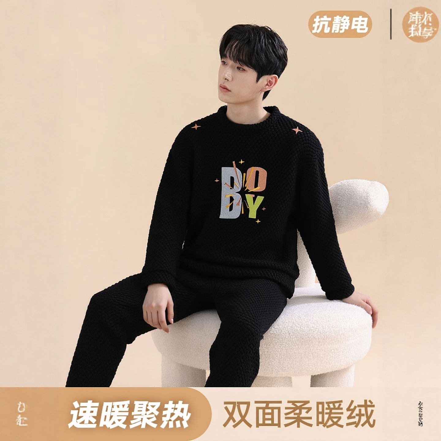 秋冬新款雪花绒可外穿男大码宽松加绒加厚暖绒保暖家居服睡衣套装